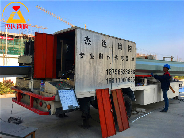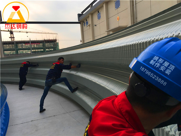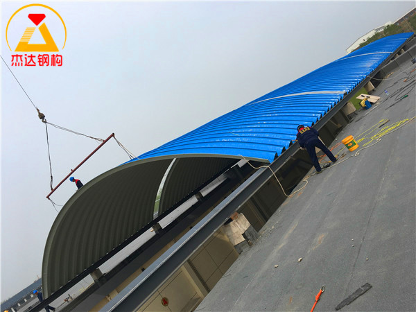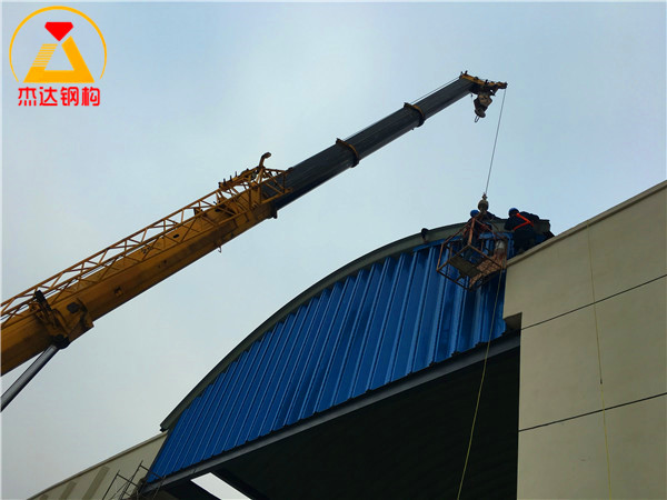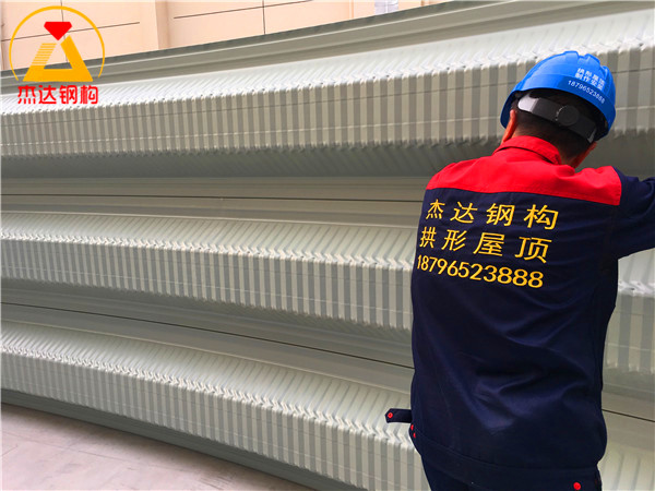 本次工程由杰達(dá)鋼構(gòu)團(tuán)隊(duì)全面負(fù)責(zé),包括拱形屋頂?shù)?strong>壓型制作與安裝作業(yè),三道通長(zhǎng)采光帶的布局,以及兩側(cè)山墻瓦的壓型安裝等關(guān)鍵環(huán)節(jié)。施工過(guò)程規(guī)范,工期緊湊,自2024年4月2日正式開(kāi)工,于4月14日順利竣工。