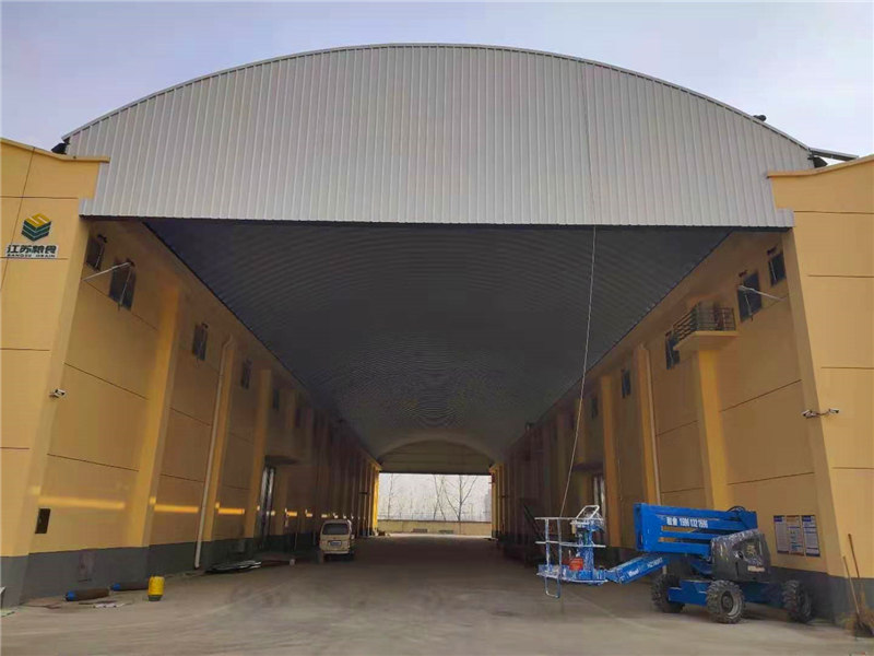 本工程位于江蘇省連云港和茂糧庫內,罩棚結構為拱形屋頂形式,整體跨度約18米,長度80米,采用的屋面板材為海藍色,厚度為1.2mm,材料為TS280GD-Z鍍鋅鋼板,具備良好的防腐與承重性能。