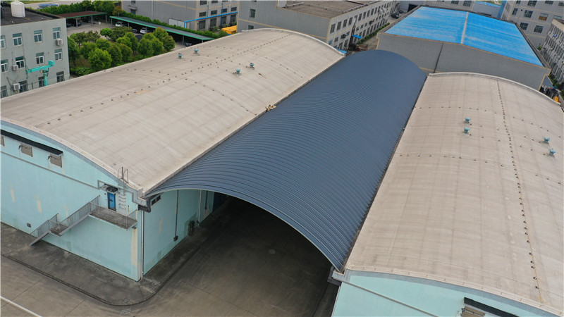 此次罩棚采用拱形結(jié)構(gòu),矢跨比約為0.2,能夠有效分散屋頂?shù)暮奢d壓力,提升整體穩(wěn)定性。拱形屋頂采用鐵青灰色涂層,與糧庫(kù)現(xiàn)有天溝相結(jié)合,保證了屋頂邊緣與糧庫(kù)主體結(jié)構(gòu)的緊密連接,減少了漏水和結(jié)構(gòu)裂縫的風(fēng)險(xiǎn)。