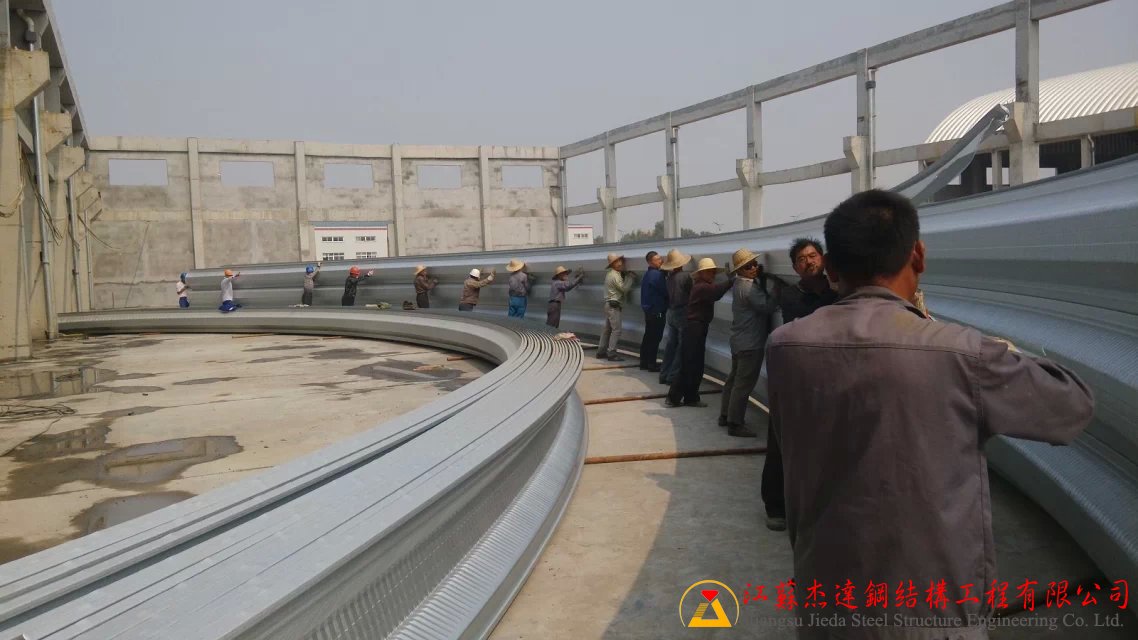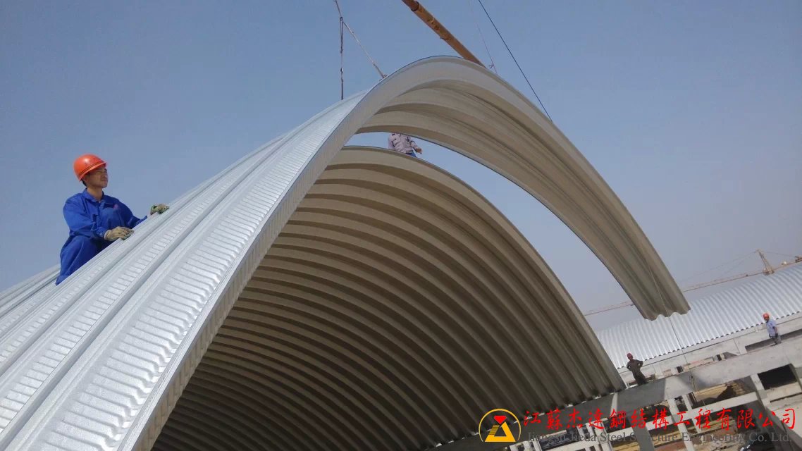 本次拱形屋頂工程施工面積達8萬多平方米,施工單位江蘇杰達鋼結構工程有限公司憑借豐富的鋼結構施工經驗,采用科學施工方案,確保項目質量和進度。施工中嚴格執行安全管理制度,加強現場監控,保障施工安全無事故。